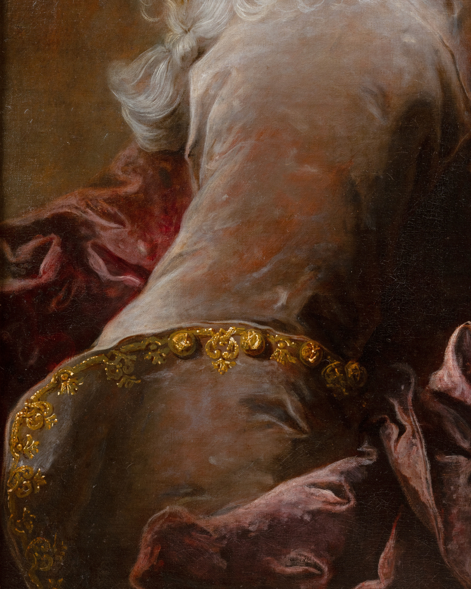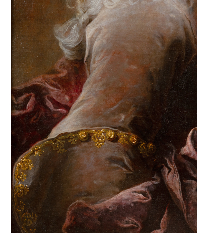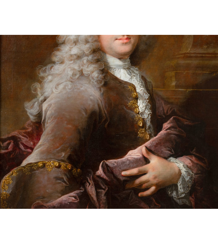 Sur le plan stylistique, l’œuvre se situe à la croisée de la solennité du portrait officiel et d’une approche plus souple et plus intime. La posture assurée, le regard direct et la richesse vestimentaire affirment le rang social du modèle, tandis que la fluidité de la touche et la subtilité des coloris adoucissent toute rigidité excessive. Tant par l’usage virtuose de la couleur que par l’attention portée aux détails, Robert Le Vrac Tournières livre ici une image exemplaire de l’aristocratie française sous la Régence, où l’art du portrait devient un vecteur privilégié d’élégance, de pouvoir et de distinction sociale.
