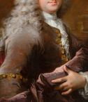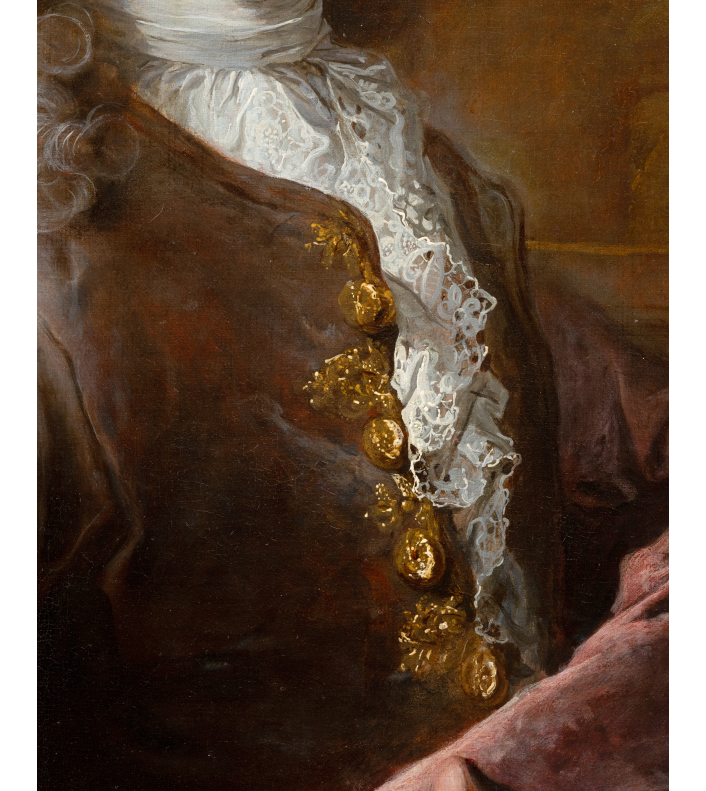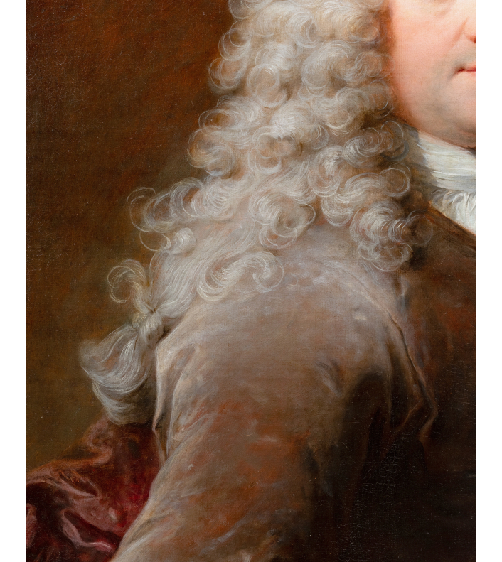 La poudre blanche de la perruque semble délicatement retomber sur l’épaule du modèle, créant un effet de dépôt presque imperceptible sur son habit de velours brun aux tonalités de marron glacé. Ce détail d’un grand raffinement pictural met en évidence l’attention portée par l’artiste aux phénomènes de matière et de surface : le contraste entre la poudre mate et claire et la profondeur chaude, légèrement satinée, du velours accentue la richesse tactile de l’ensemble, tout en renforçant l’impression de présence réelle du personnage.