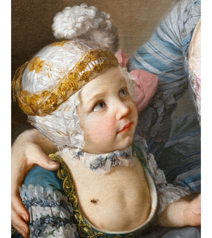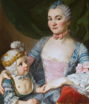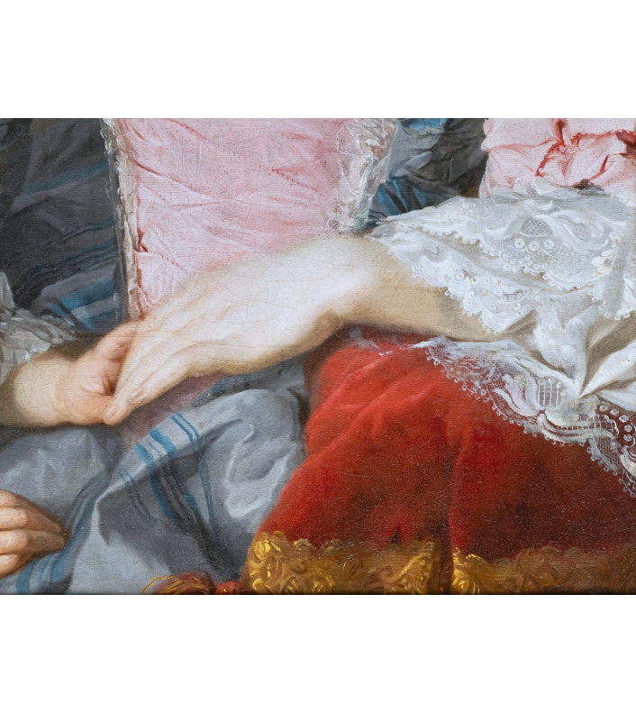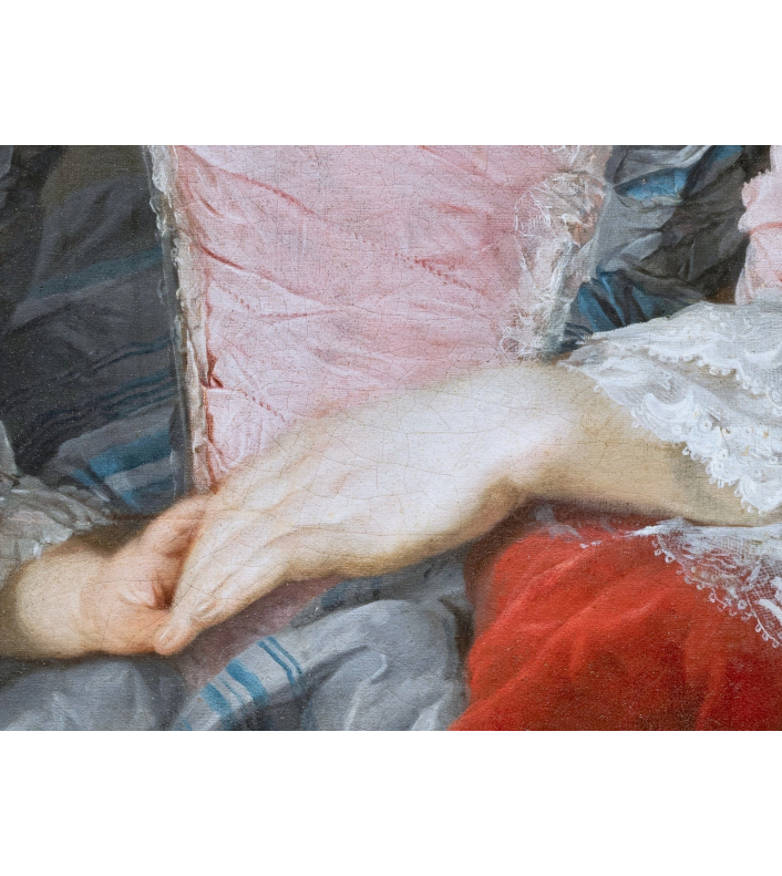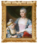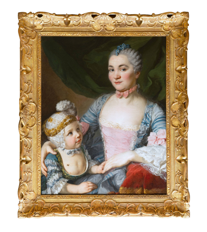 L’œuvre que nous présentons constitue un exemple rare du portrait familial français du milieu du XVIIIème siècle. Evoquant à la fois la tendresse maternelle et la continuité dynastique, l’accent est mis sur l’exubérance vestimentaire des deux protagonistes dans le but d’afficher leur statut élevé dans la société et de souligner la richesse familiale.