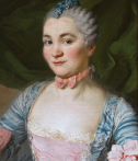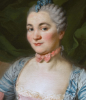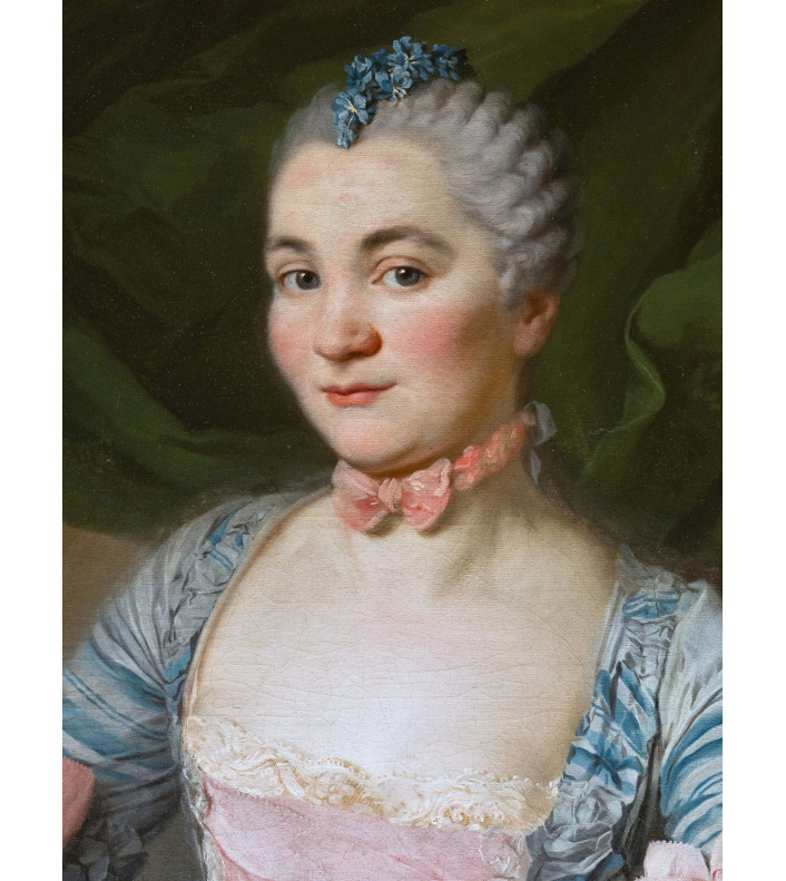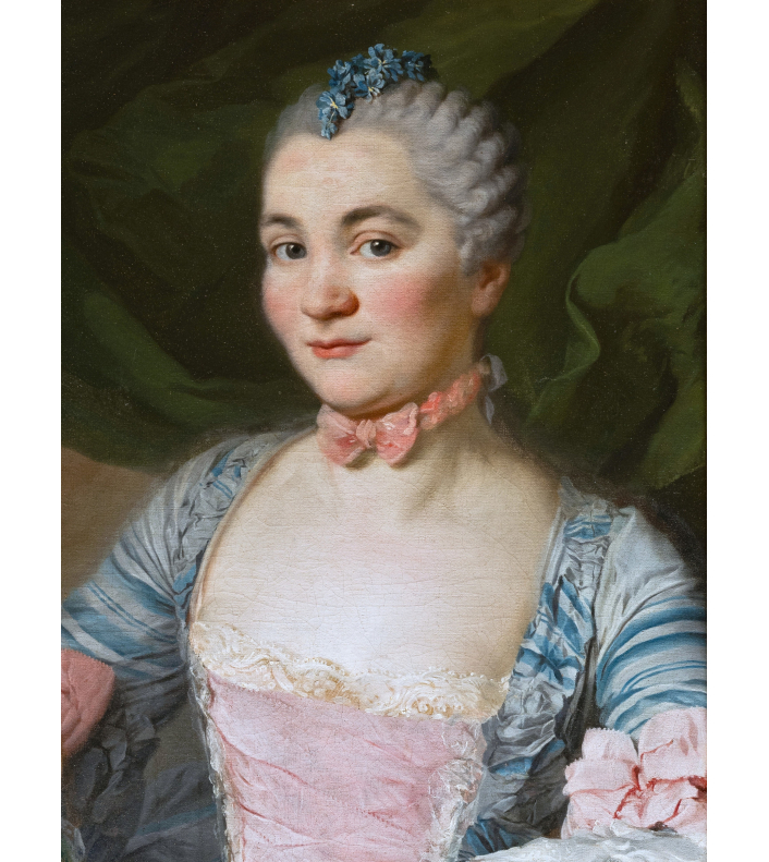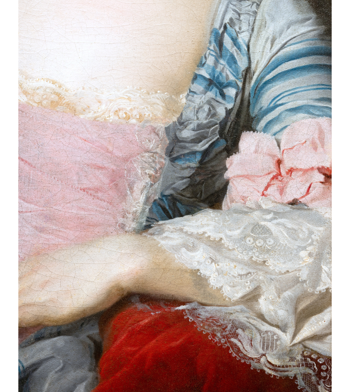 Suivant la mode de l’époque, la jeune femme est vêtue d’une robe « à la française » de soie bleue rayée au large décolleté carré orné de rubans plissés, et d’un corset de soie rose bordé de fines dentelles blanches. Les manches s’arrêtant au coude, sont parées de larges nœuds de ruban rose et des volants de dentelles superposés. Elle porte au cou le ruban rose noué du même ton que son corset