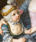Son fils, positionné par le peintre à sa droite, est portraituré en buste, debout s’appuyant sur les genoux de sa mère.