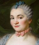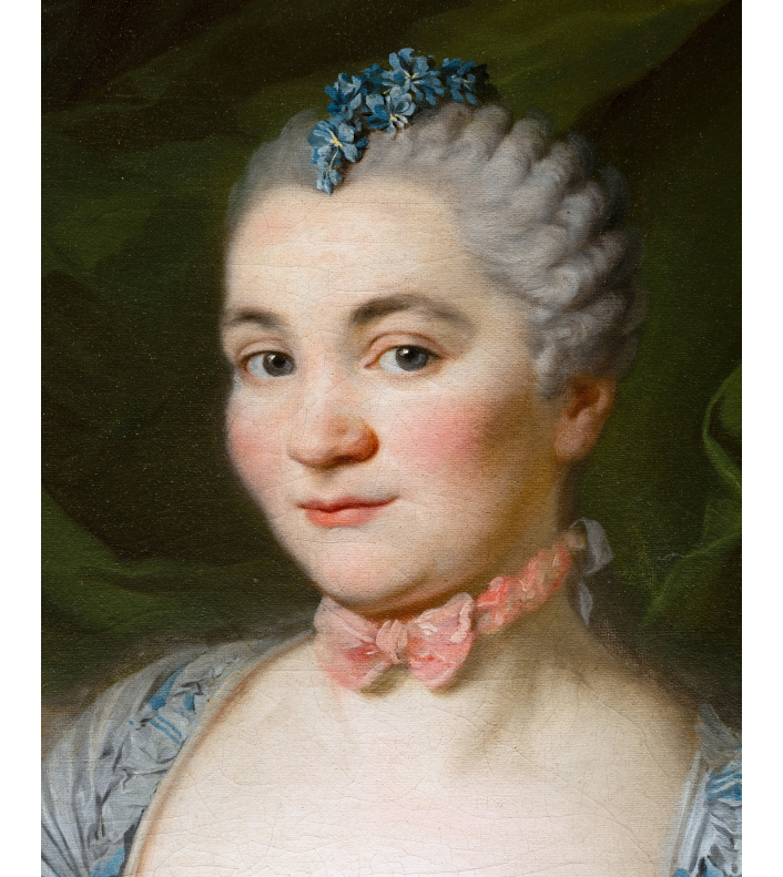 Ses cheveux sont poudrés et coiffés en « tête de mouton », très à la vogue durant le règne de Louis XV et pour souligner la fraîcheur printanière du modèle quelques fleurs bleues sont piquées dans les mèches au sommet de sa tête.