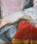 D’un geste protecteur et bienveillant elle pose sa main droite sur l’épaule de son fils, signifiant symboliquement sa volonté de le protéger des dangers du monde, tandis que son bras gauche, fléchi au coude est élégamment posé sur un coussin de velours rouge aux passementeries d’or.