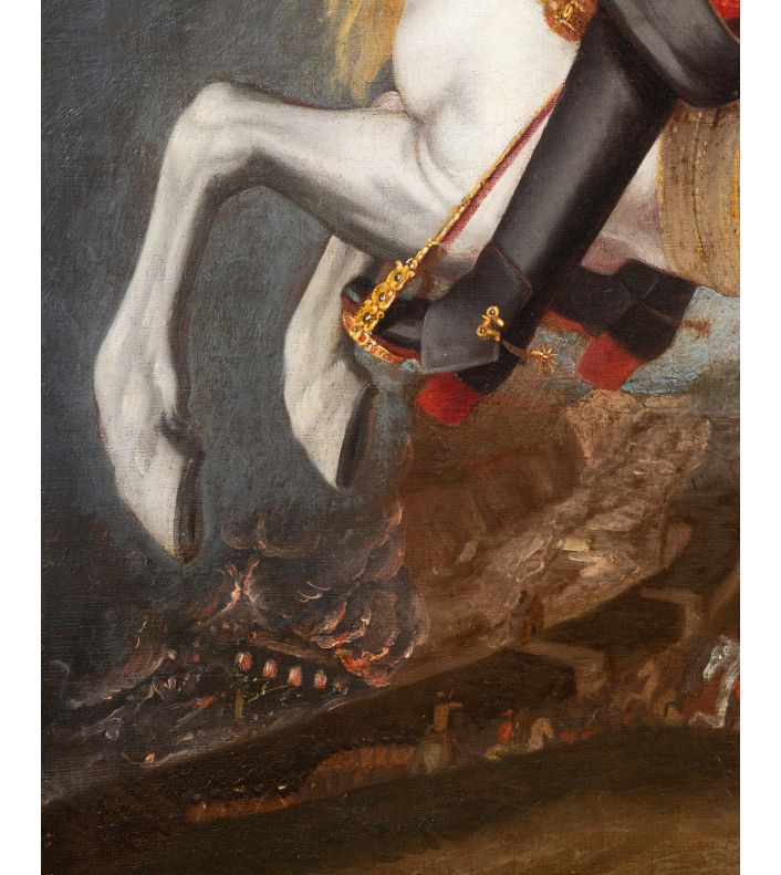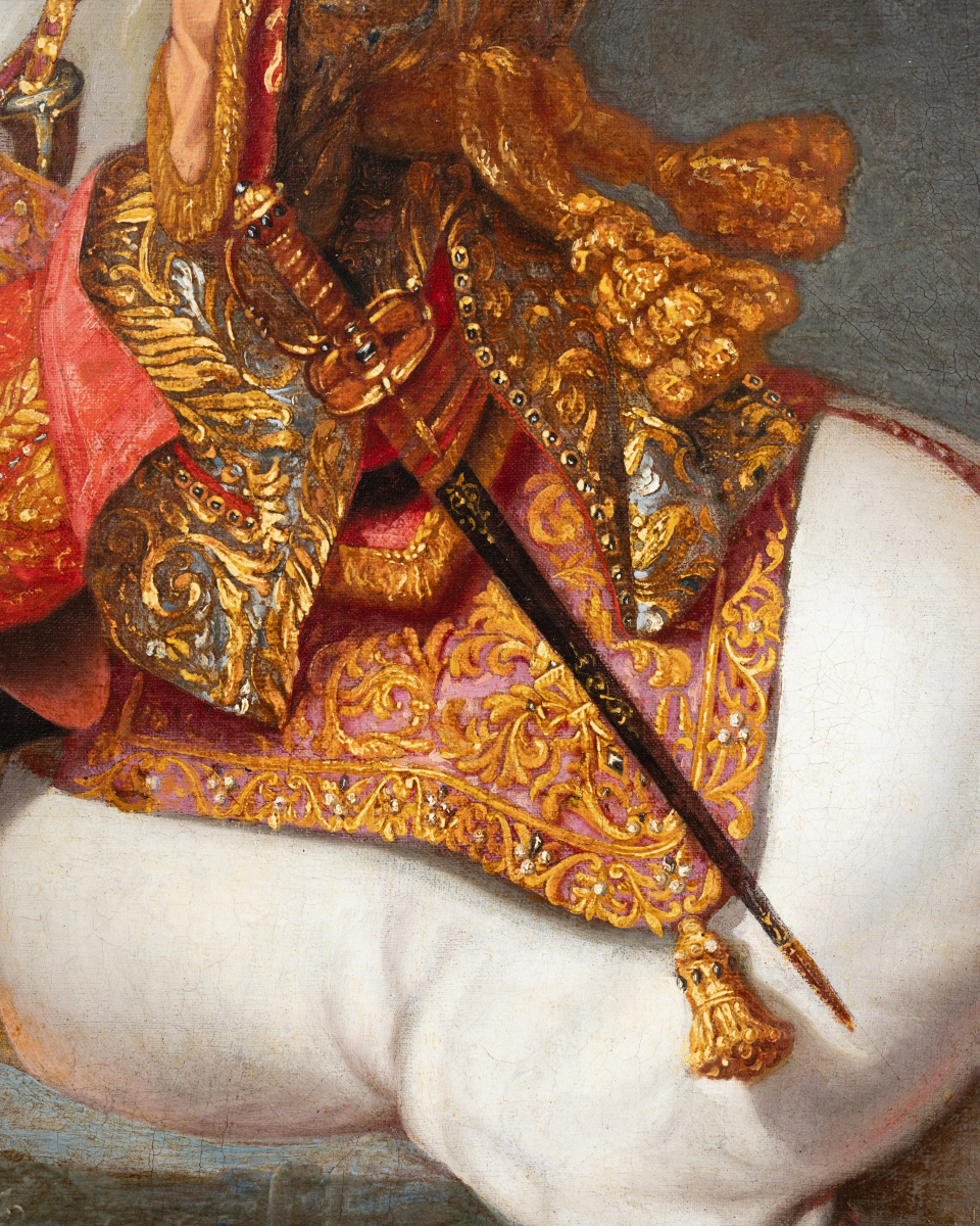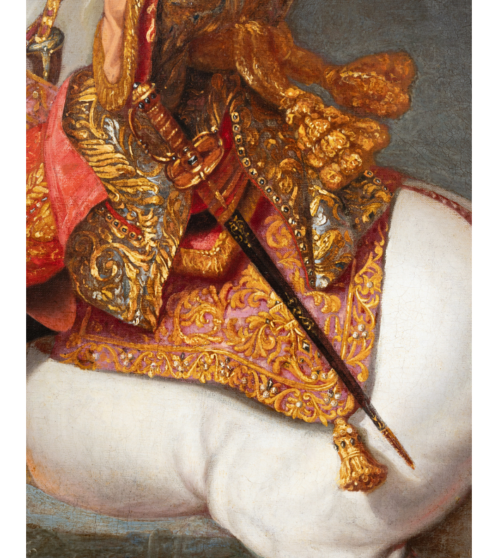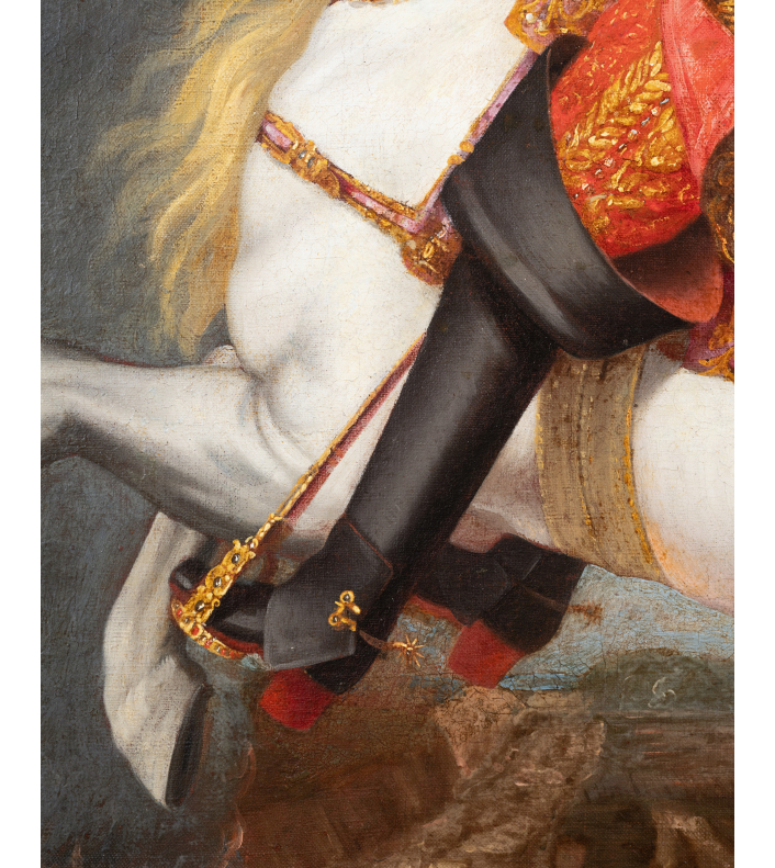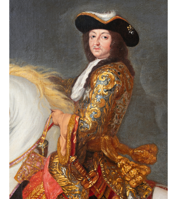 Notre portrait équestre d'apparat représente le roi âgé d'une trentaine d'années. Louis XIV y apparaît sous les traits d'un chef d'armée, dominant une scène de bataille à l'arrière-plan. Il tient le bâton de commandement, signe de son autorité, et est monté sur un cheval blanc dit « soupe de lait », cabré, symbole de la victoire. Le roi est habillé somptueusement d'un justaucorps brodé de fils d'or, un chapeau noir à plume blanche, la cravate en dentelle. Son épée, ses étriers ainsi que le harnachement du cheval sont ornés de pierres précieuses et diamants, témoignant de la richesse et du pouvoir du cavalier. Ses bottes noires à la semelle et talon rouge sont garnies d'éperons d'or.
