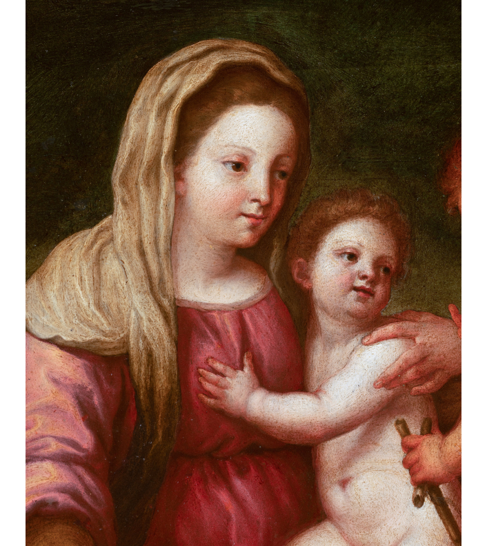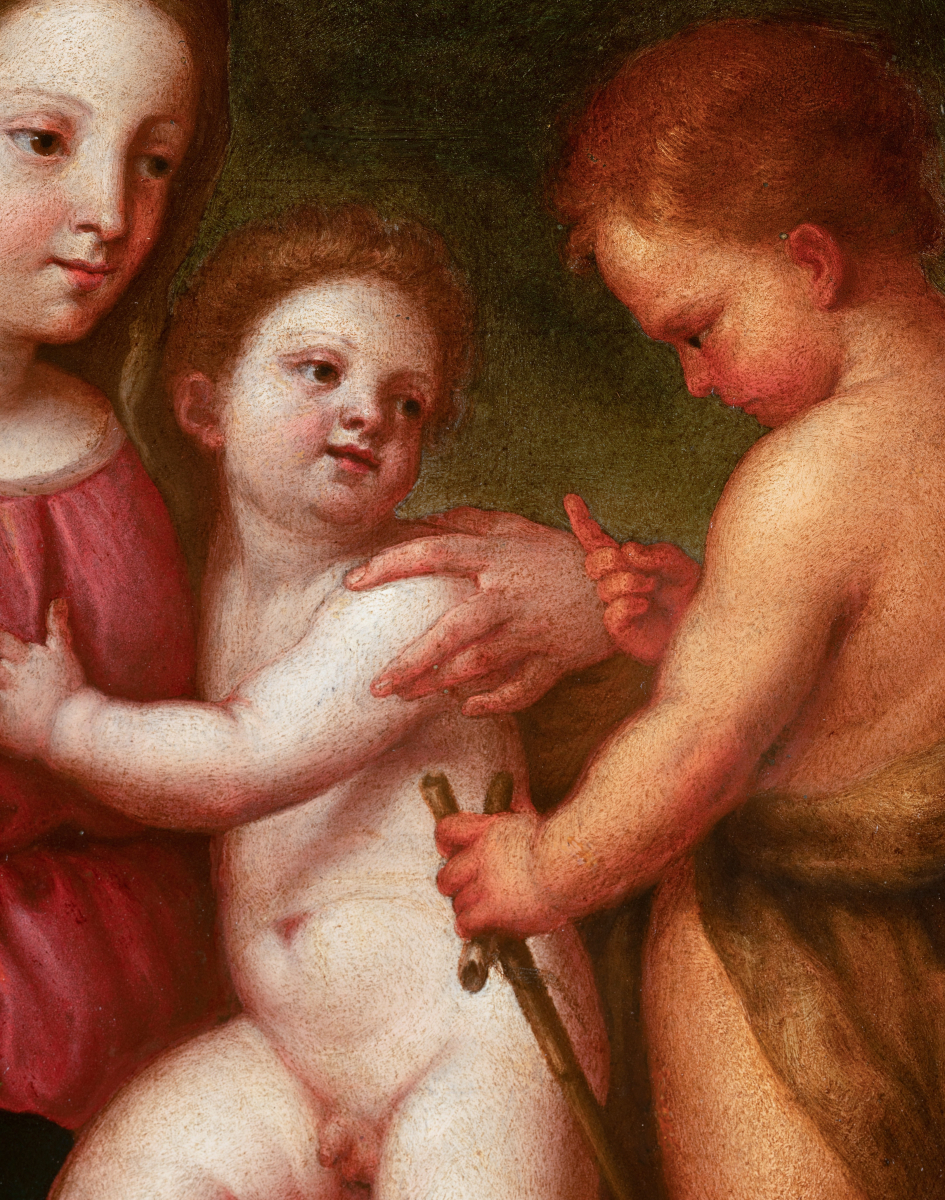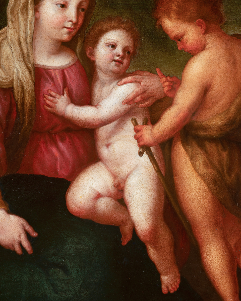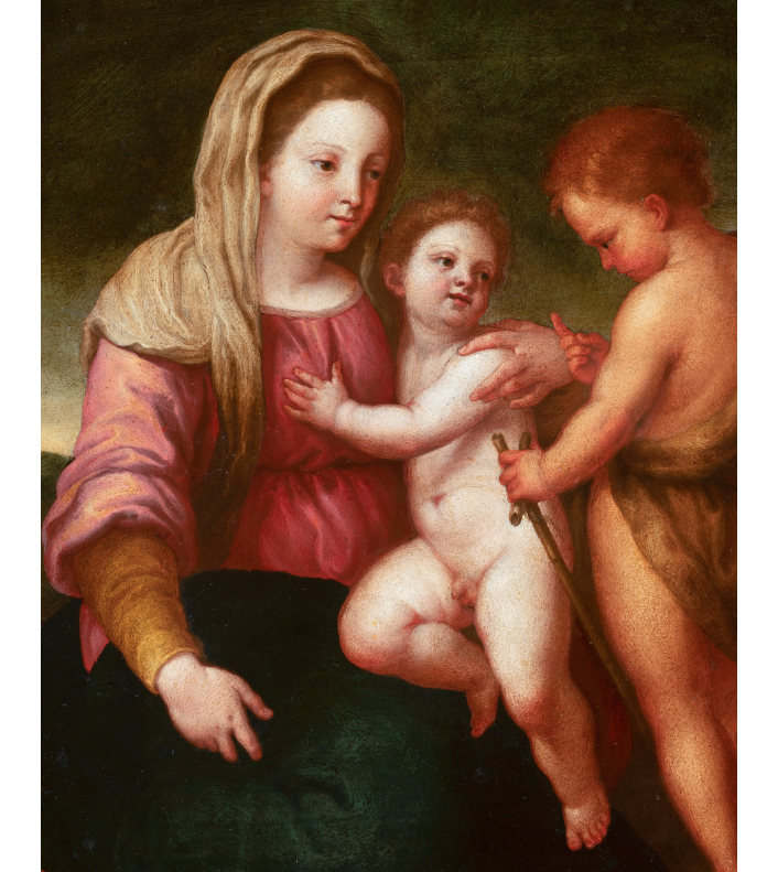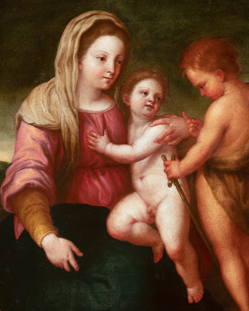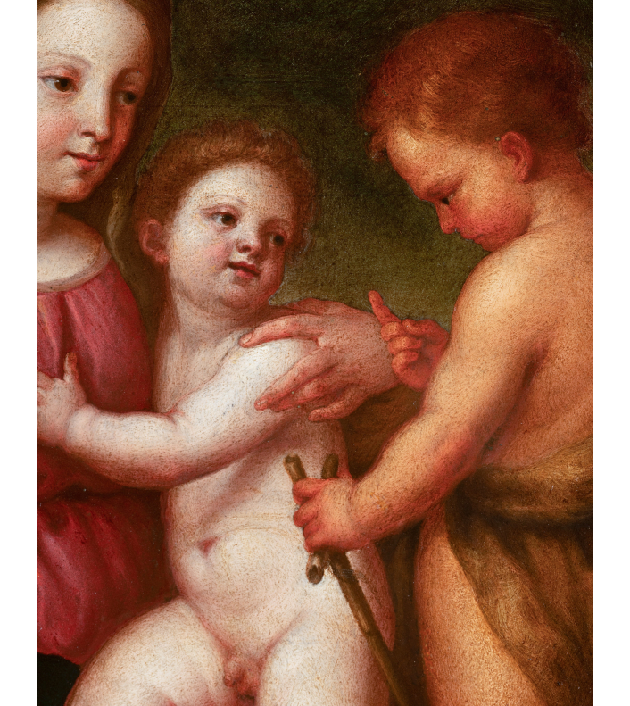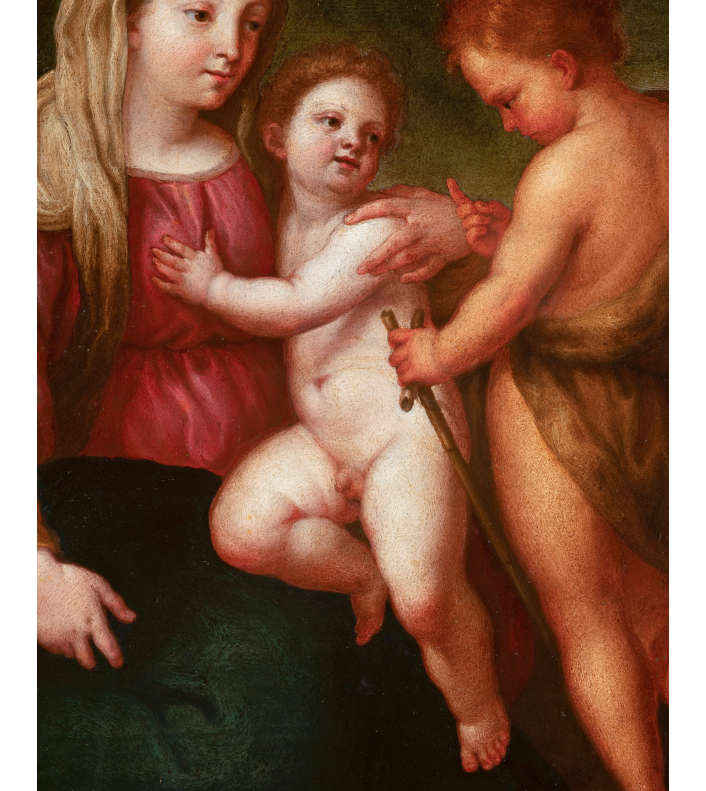 Notre artiste anonyme de l’école Florentine s’inspire des œuvres d’Andrea del Sarto (Florence, 1486-1530), les figures de la Vierge et Jésus sont empruntées à « la Sainte Famille » conservée au Louvre (inv. 1515), tandis que la figure de Saint Jean Baptiste est en partie reprise de la Madonne Corsini, dont l’original est perdu, mais une copie est conservée dans la Collection Lord Egremont à Petworth House, West Sussex (Collection Duc de Buckingham).