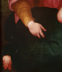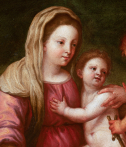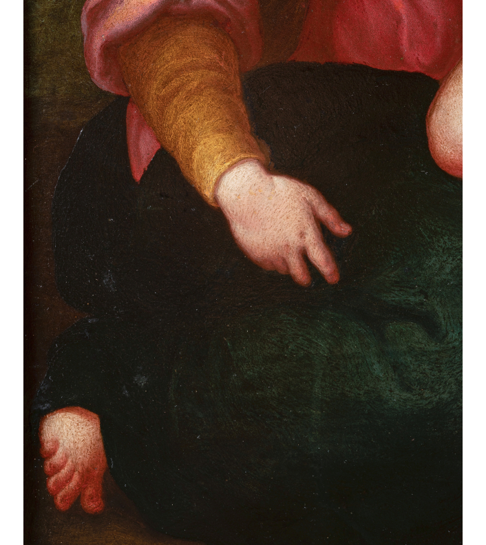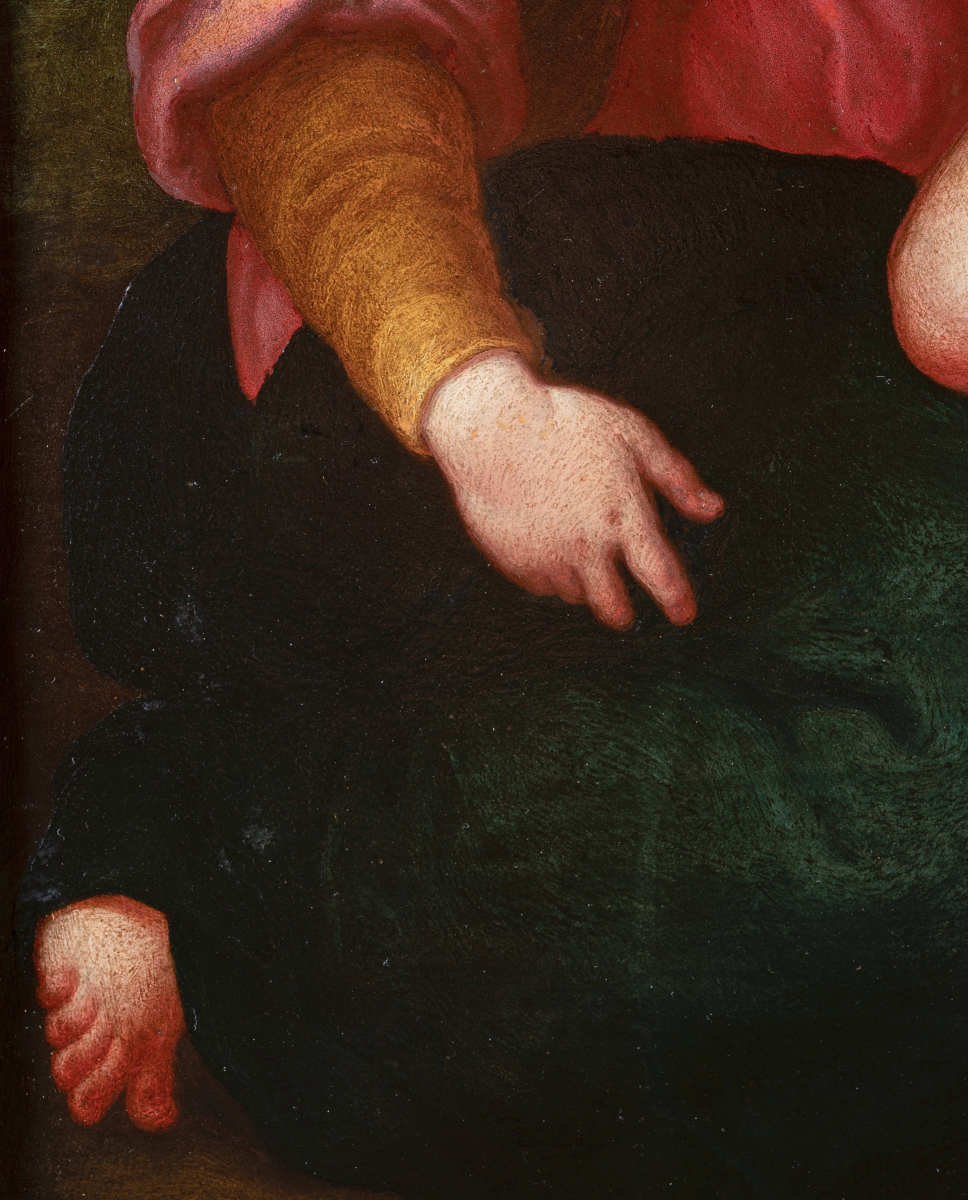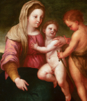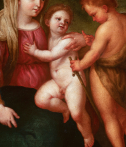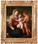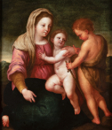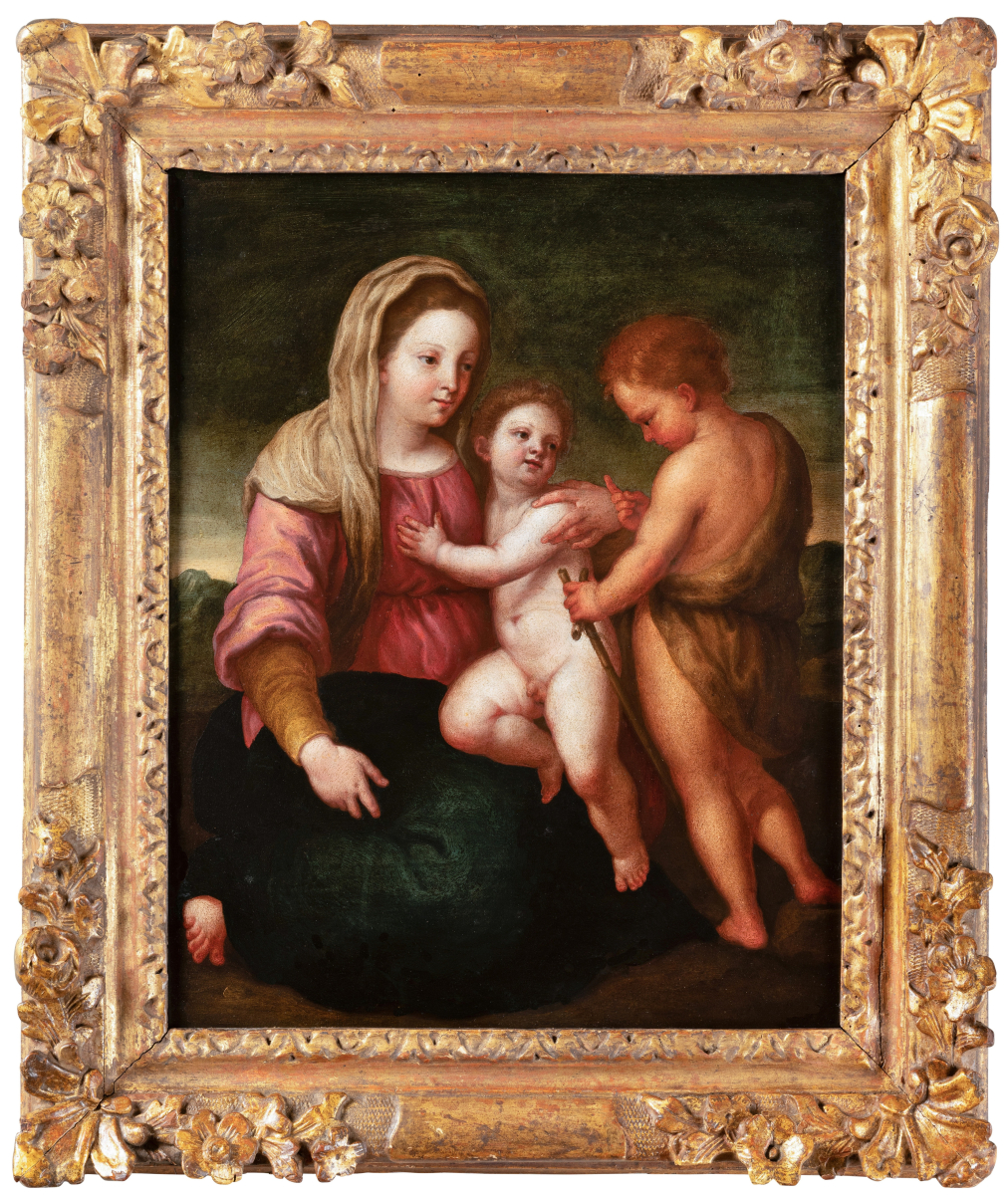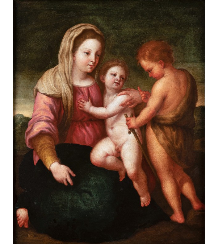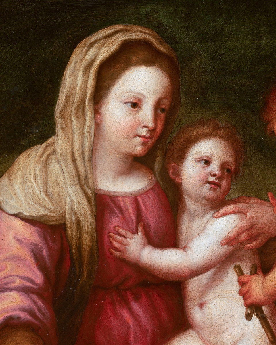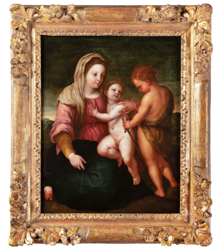 Notre artiste anonyme de l’école Florentine s’inspire des œuvres d’Andrea del Sarto (Florence, 1486-1530), les figures de la Vierge et Jésus sont empruntées à « la Sainte Famille » conservée au Louvre (inv. 1515), tandis que la figure de Saint Jean Baptiste est en partie reprise de la Madonne Corsini, dont l’original est perdu, mais une copie est conservée dans la Collection Lord Egremont à Petworth House, West Sussex (Collection Duc de Buckingham).