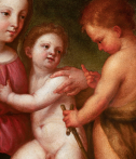 Il tient dans sa main gauche son attribut, la croix de roseau, qu’il présente au Christ préfigurant la Passion de Jésus. Il désigne de l’index de sa main droite l’enfant qui le regarde attentivement, tandis que saint Jean, empreint de mélancolie, tourne le regard vers la gauche.